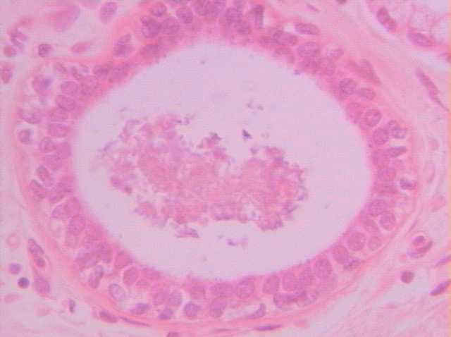 高倍下(400x)之乳腺管,其管壁上皮為複層立方上皮所構成,而於上皮細胞外為一層平滑肌細胞所包圍。當平滑肌受神經刺激收縮時,將管腔中儲存之乳腺分泌物擠出,可提供乳汁分泌時之動力。